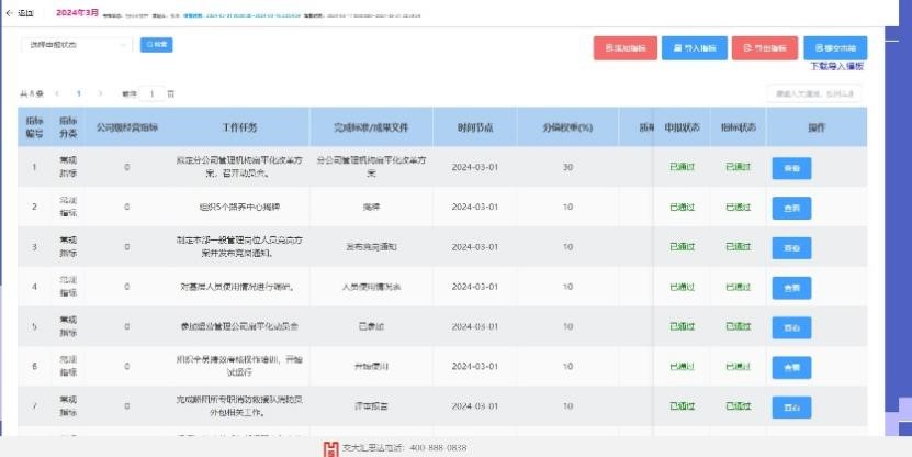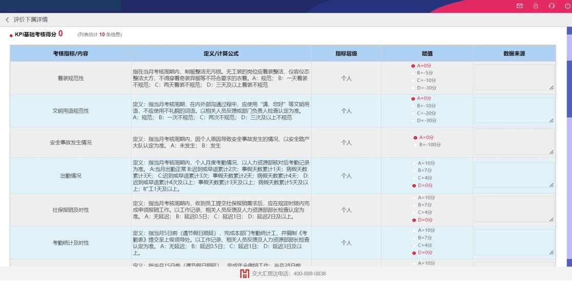 KPI即关键绩效指标,是把公司的战略目标分解为可操作的工作目标的工具。KPI可以使部门、班组主管明确部门、班组的主要责任,并以此为基础,明确员工的业绩衡量指标。考核内容主要包括分公司经营类指标、部门工作、岗位工作等维度,项目组根据分解的战略目标并结合岗位职责,编写汇总成KPI指标库,导入系统,后期无需每月调整,不增加员工负担。每月月底,由部门负责人登录绩效管理软件系统,根据员工实际工作的情况,按照系统指标库中的工作标准,进行评分。员工也可登录自己的账号,查看每月的工作指标和工作标准,极大地增加了考核的透明度,确保考核的客观性和公正性。